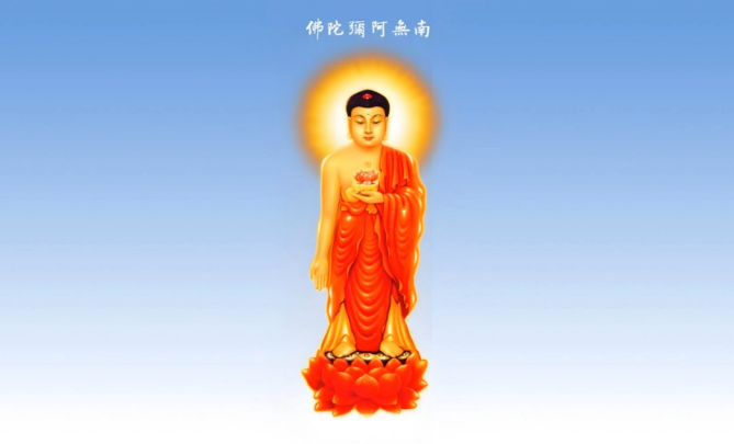 佛告阿难,及韦提希,此想成已,次当更观无量寿佛身相光明。阿难当知,无量寿佛,身如百千万亿夜摩天阎浮檀金色。佛身高六十万亿那由他恒河沙由旬。眉间白毫,右旋宛转,如五须弥山。佛眼如四大海水,青白分明。身诸毛孔,演出光明,如须弥山。彼佛圆光,如百亿三千大千世界。于圆光中,有百万亿那由他恒河沙化佛。一一化佛,亦有众多无数化菩萨,以为侍者。无量寿佛,有八万四千相。一一相中,各有八万四千随形好。一一好中,复有八万四千光明。一一光明,遍照十方世界念佛众生,摄取不舍。其光相好,及与化佛,不可具说。但当忆想,令心眼见。见此事者,即见十方一切诸佛。以见诸佛故,名念佛三昧。作是观者,名观一切佛身。以观佛身故,亦见佛心。佛心者,大慈悲是。以无缘慈,摄诸众生。作此观者,舍身他世,生诸佛前,得无生忍。是故智者,应当系心,谛观无量寿佛。观无量寿佛者,从一相好入。但观眉间白毫,极令明了。见眉间白毫相者,八万四千相好,自然当现。见无量寿佛者,即见十方无量诸佛。得见无量诸佛故,诸佛现前授记。是为遍观一切色身相,名第九观。作是观者,名为正观。若他观者,名为邪观。
